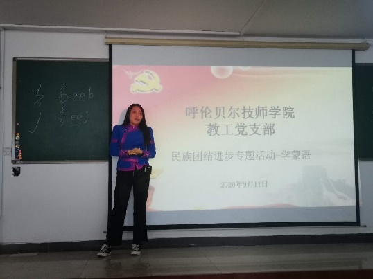 三是在促進(jìn)民族團結方面。今年9月是第37個(gè)民族團結活動(dòng)月,為筑牢中華民族共同體意識,促進(jìn)民族團結,教工支部開(kāi)展了“民族團結一家親,每周一句蒙語(yǔ)活動(dòng)”,活動(dòng)熱烈有趣,增進(jìn)了各民族之間的感情。