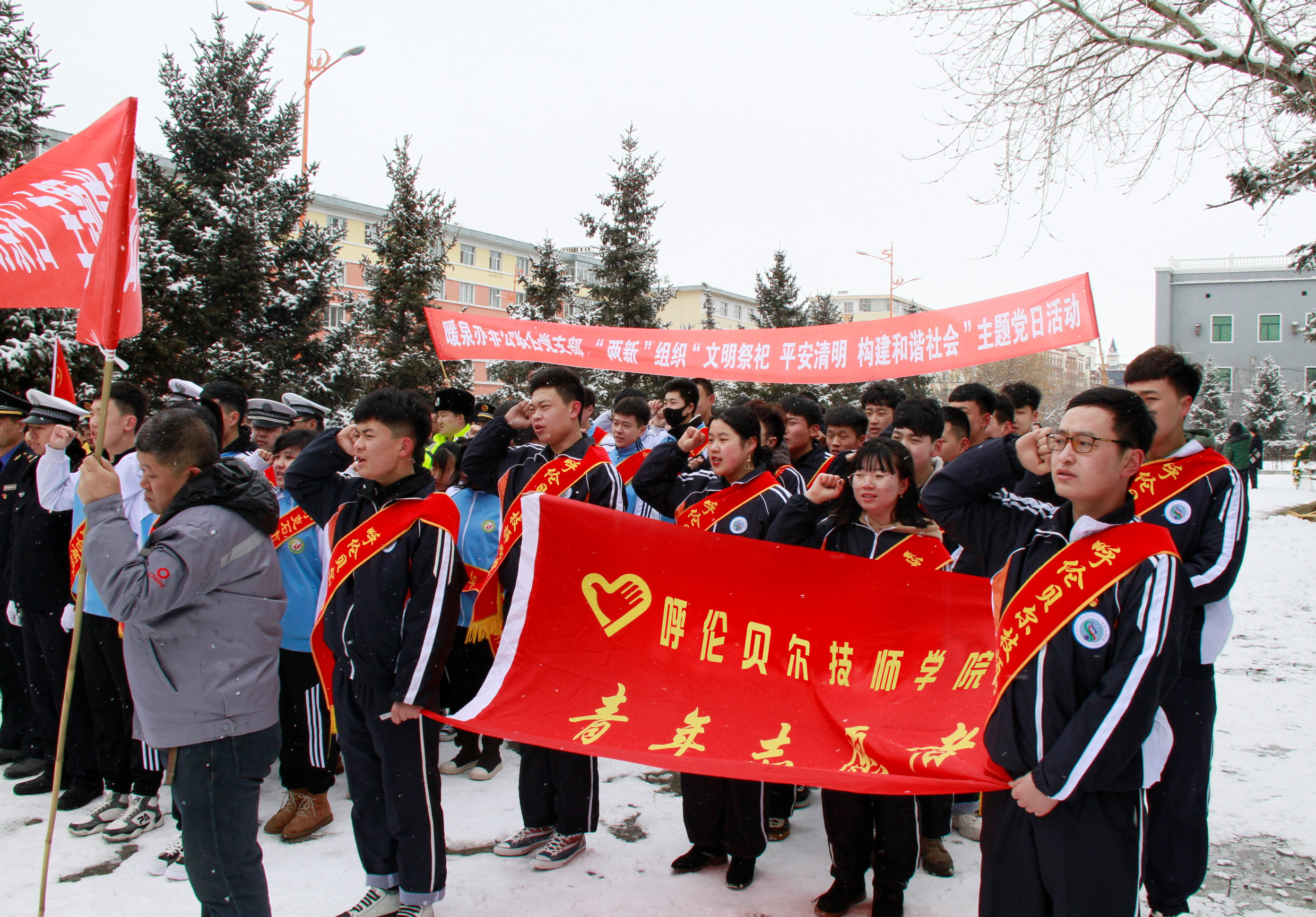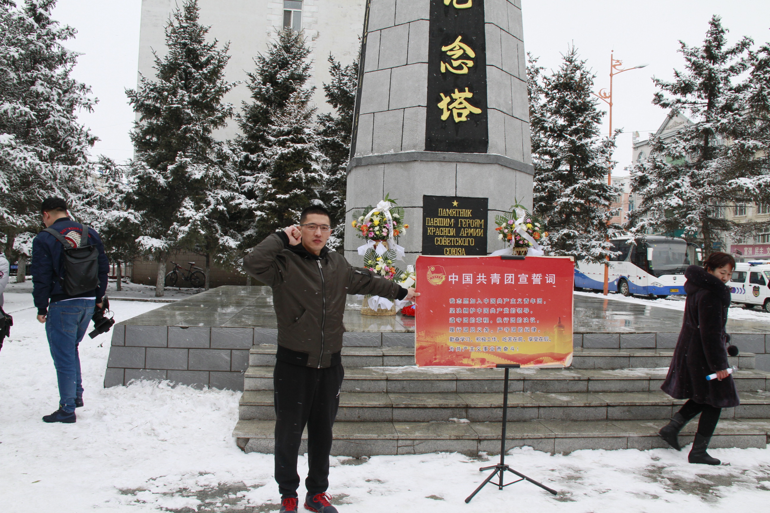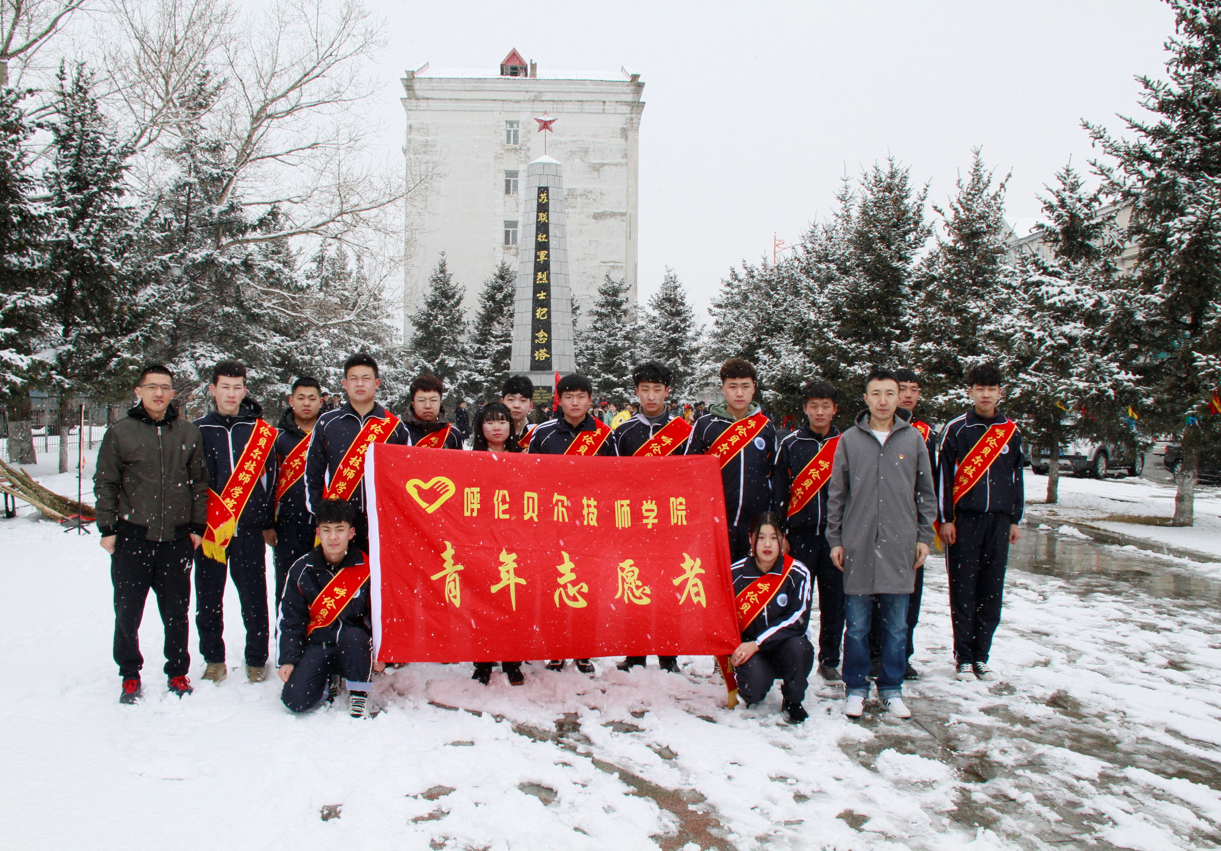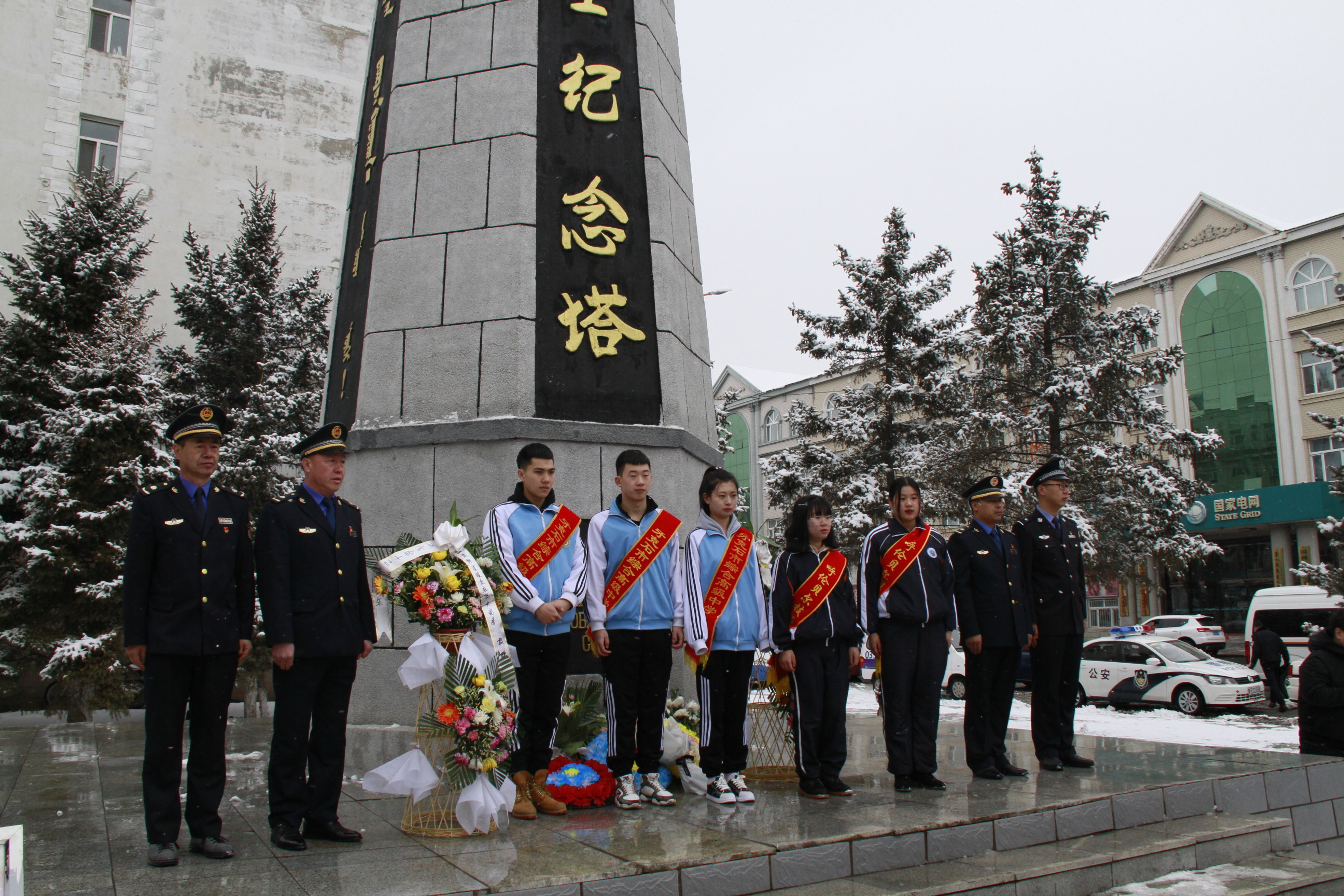 云幕低垂,輕雪紛飛,豐碑巍峨,浩氣長(cháng)存。在傲然聳立的蘇聯(lián)紅軍烈士紀念塔前,共青團員們學(xué)習了為解放牙克石地區而犧牲的別斯里科夫等42位蘇聯(lián)紅軍烈士英勇事跡。學(xué)院聯(lián)合牙克石市市人民醫院、綜合高中、牙克石市市氣象局、森林公安局、林業(yè)生態(tài)研究院、牙克石市城西城市管理綜合執法中隊、龍北水泥公司、牙克石市市公安局交警大隊、病蟲(chóng)害防治所、牙克石市暖泉派出所、街道各黨支部、“兩新”組織等單位黨員代表和學(xué)生團員代表們莊嚴肅立,懷著(zhù)崇敬的心情,向蘇聯(lián)紅軍烈士敬獻花籃、鞠躬默哀,向他們致以深深的哀悼和敬意。