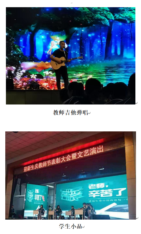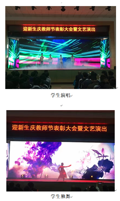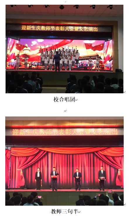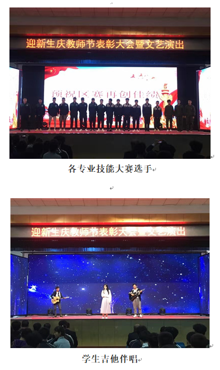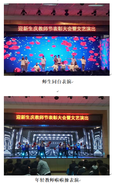 表彰大會(huì )結束后進(jìn)行了精彩的文藝演出。演出在合唱《我和我的祖國》中拉開(kāi)序幕,舞蹈、小品、三句半、歌舞等節目一一上演。各個(gè)專(zhuān)業(yè)參加技能大賽訓練的學(xué)生上臺分享訓練心得體會(huì ),充分的展現了學(xué)生們吃苦耐勞,精益求精的工匠精神,同時(shí)為全院學(xué)生起到了積極向上的榜樣作用。此次演出節目豐富多彩,動(dòng)感十足,展示了我院師生豐富多彩的精神文化生活及多才多藝的良好形象,學(xué)生們用歡快嘹亮的歌聲、活力四射的舞步,表達了對教師最深情的問(wèn)候和祝福,贏(yíng)得了全院師生的陣陣掌聲。最后在新教師的合唱中圓滿(mǎn)落幕。