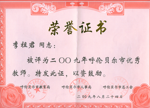 2009年獲呼倫貝爾市優(yōu)秀教師