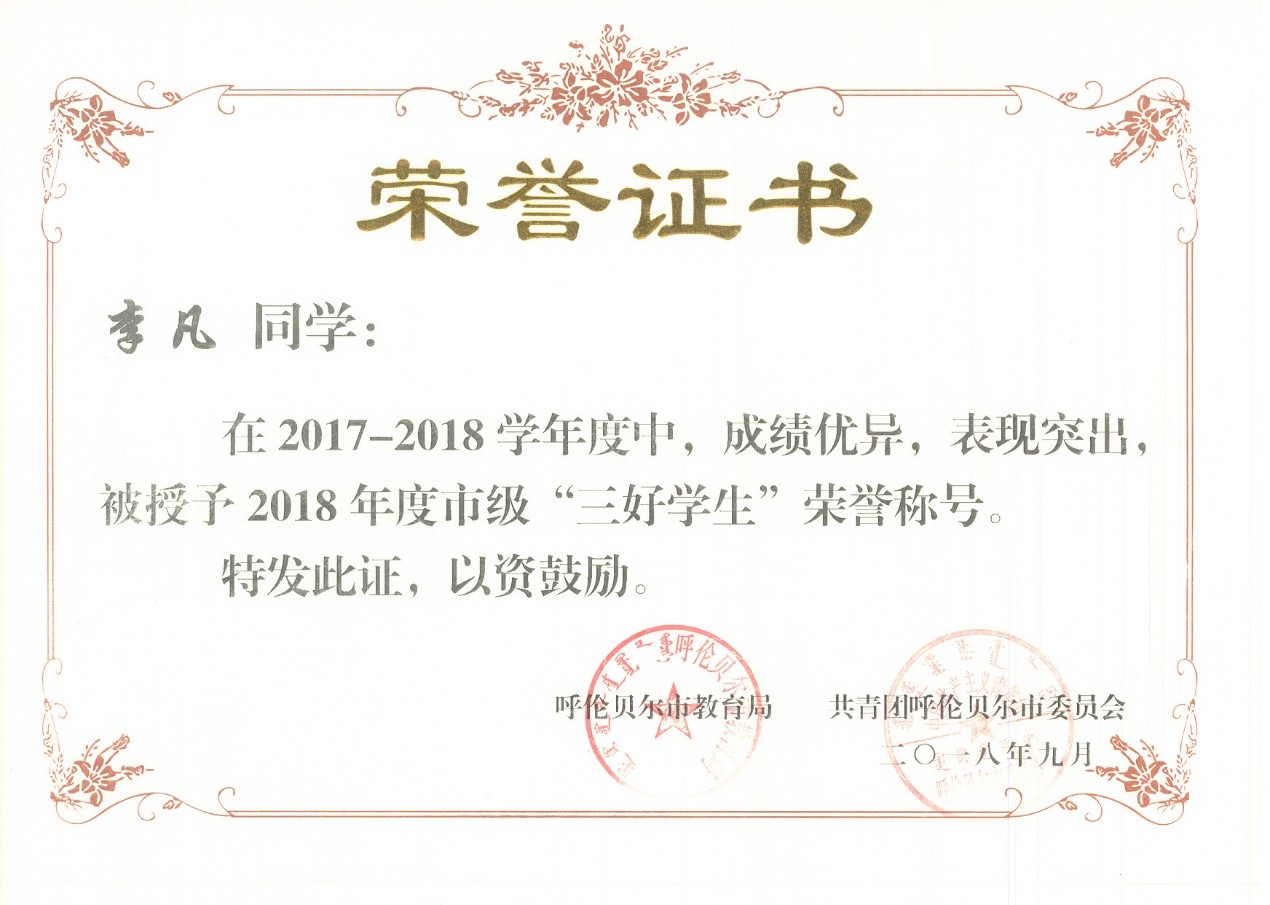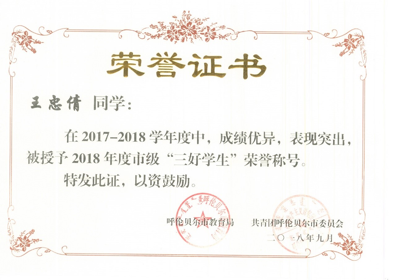 | 2018 | 于澤宇 | 女 | 微機1631班 | 三好學(xué)生 | 區級 |