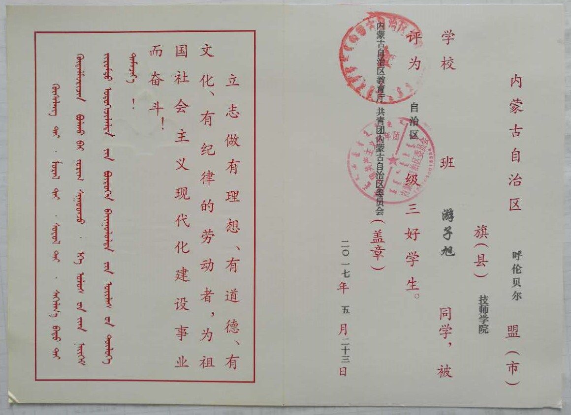 | 2017 | 王胡日查 | 男 | 汽修1451班 | 優(yōu)秀學(xué)生干部 | 區級 |
