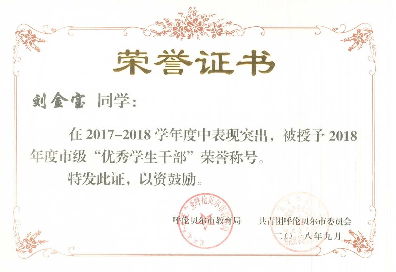 | 2018 | 劉英爽 | 男 | 焊接1581班 | 優(yōu)秀學(xué)生干部 | 區級 |