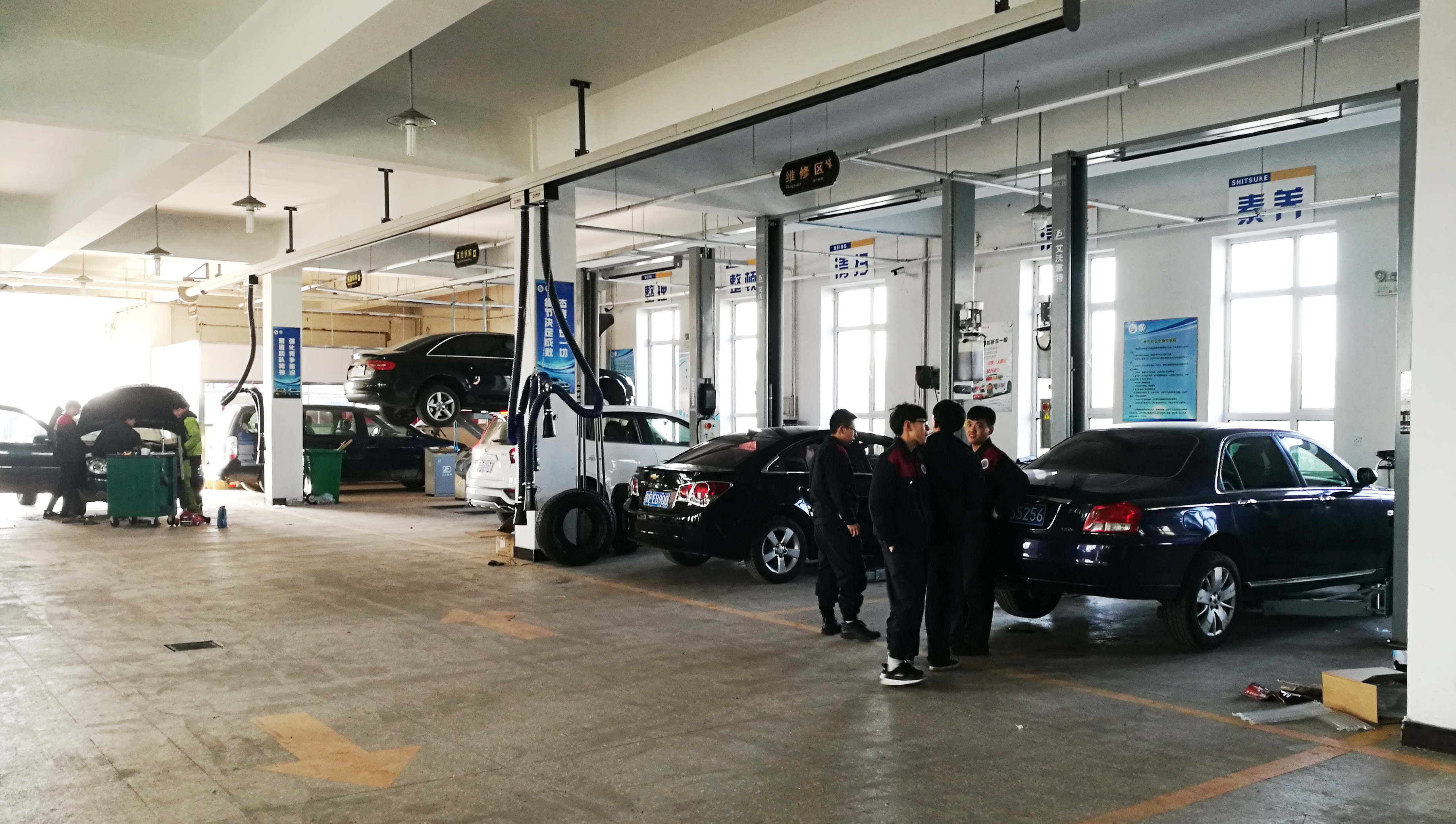 實(shí)訓中心按照“4S衛星店”的模式建設,面積800多平方米,具有完備的高壓供氣系統、尾氣抽排系統,各種維修設備及檢測設備100多種,車(chē)間總值100多萬(wàn)元??蛇M(jìn)行汽車(chē)快修、快速保養、常規修理、疑難故障診斷、四輪定位、輪胎動(dòng)平衡、扒胎等各項生產(chǎn)任務(wù);并建有業(yè)務(wù)接待區、客戶(hù)休息室等配套設施。