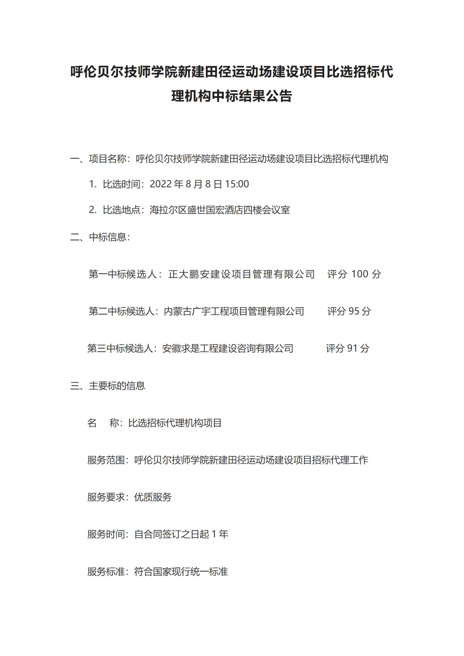 呼倫貝爾技師學(xué)院新建田徑運動(dòng)場(chǎng)建設項目比選招標代理機構中標結果公告