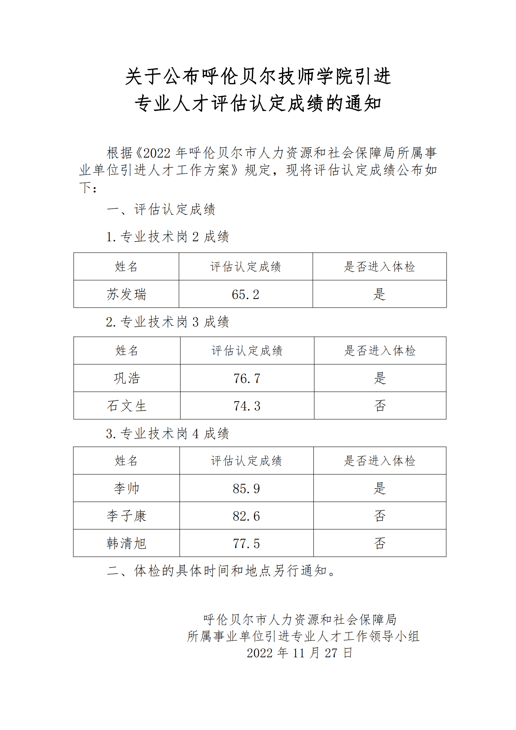 關(guān)于公布呼倫貝爾技師學(xué)院引進(jìn)專(zhuān)業(yè)人才評估認定成績(jì)的通知