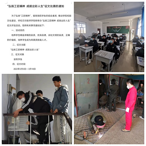 學(xué)院發(fā)動(dòng)學(xué)生進(jìn)一步踐行技能成才、技能報國行動(dòng),通過(guò)晚自習素質(zhì)教育、主題征文、主題班會(huì )等,引導學(xué)生認知、思考、踐行勞模精神、勞動(dòng)精神、工匠精神。開(kāi)展我愛(ài)我“家”、技能訓練和創(chuàng )新創(chuàng )業(yè)實(shí)踐活動(dòng),在全院營(yíng)造“技能成就精彩、奮斗正當其時(shí)”的氛圍。