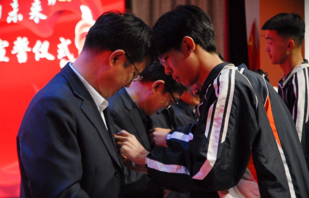 優(yōu)秀共青團員為領(lǐng)導佩戴團徽