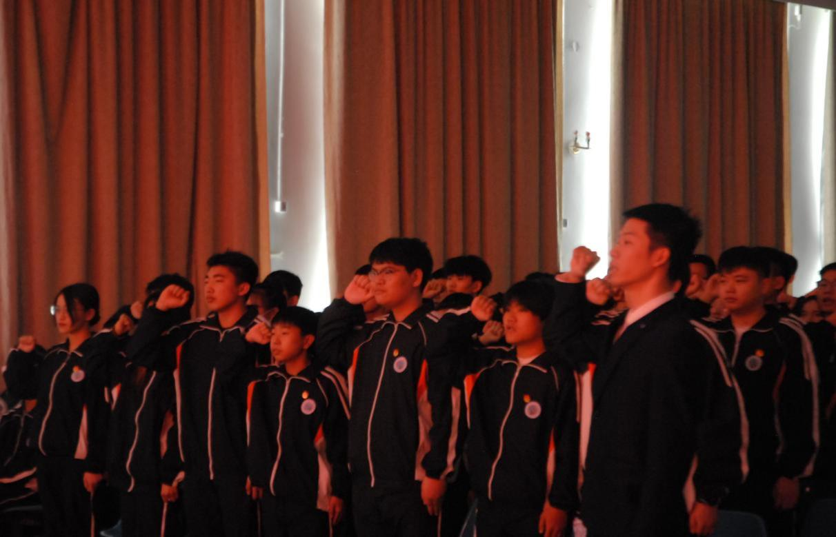 佩戴好團徽的全體新團員在學(xué)院團委委員姜韜老師的帶領(lǐng)下,面對鮮紅的團旗,舉右拳莊嚴宣誓。